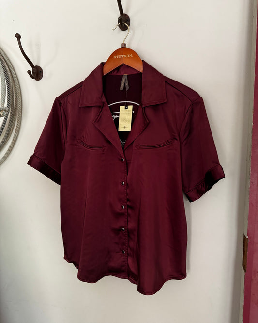 Cowboy Embroidered Short Sleeve Blouse – Western Satin Top