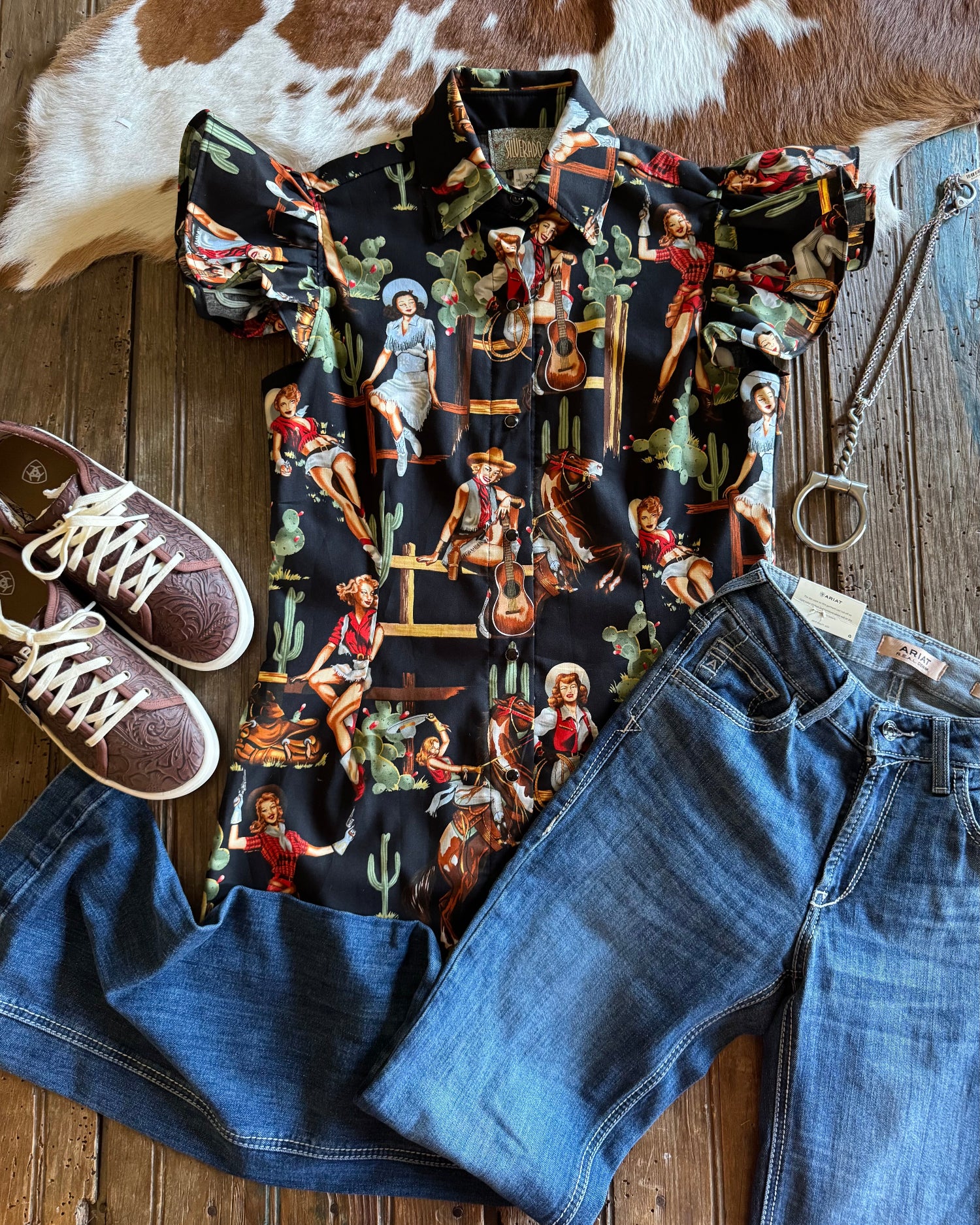 Introducing the Blake Shirt, the perfect blend of western charm and chic style. This sleeveless blouse features a stunning cowgirl pinup fabric in sleek black, with a feminine ruffle cap sleeve detail and a classic button up design. Designed to flatter with a fitted silhouette, it's a must-have addition to your wardrobe.