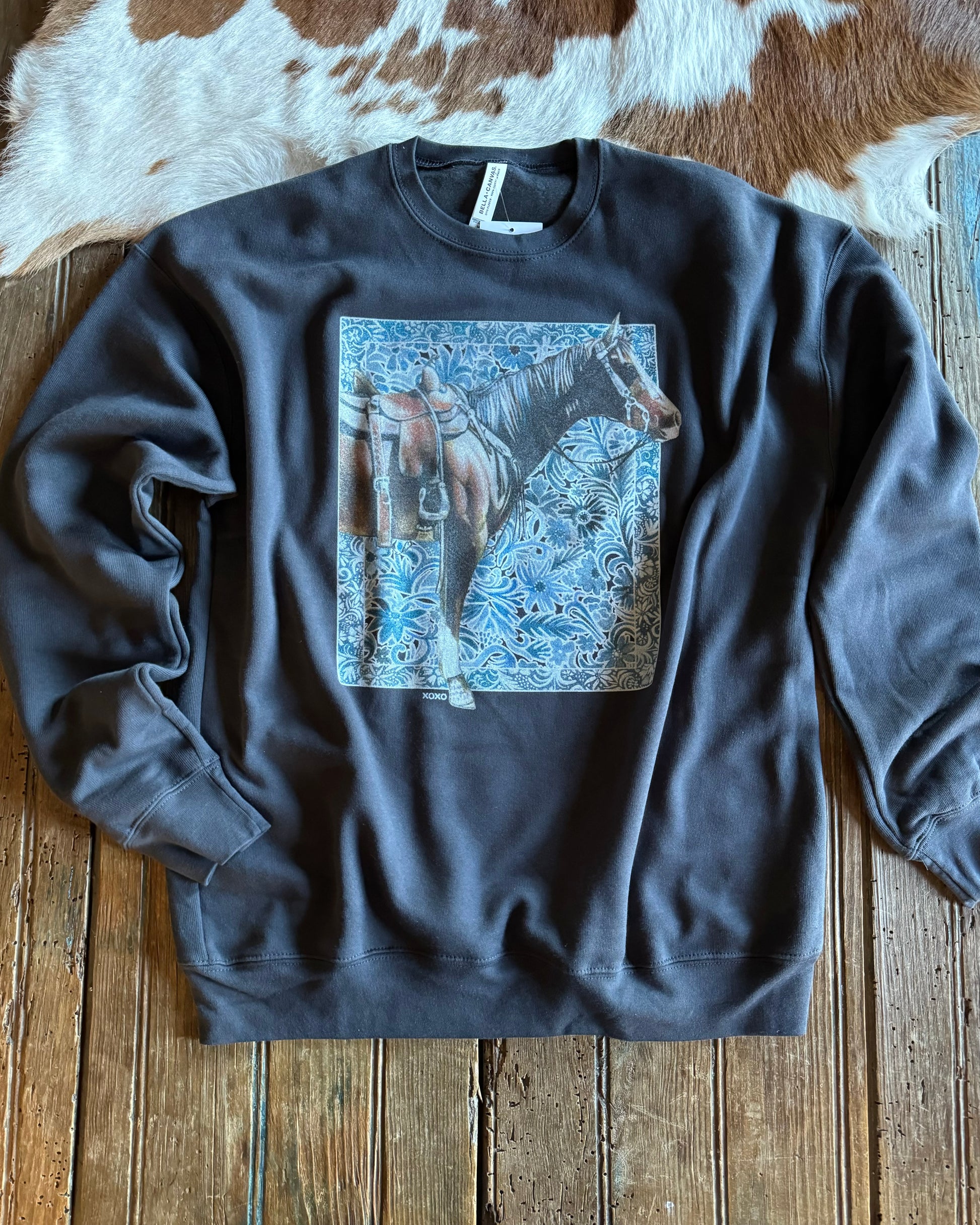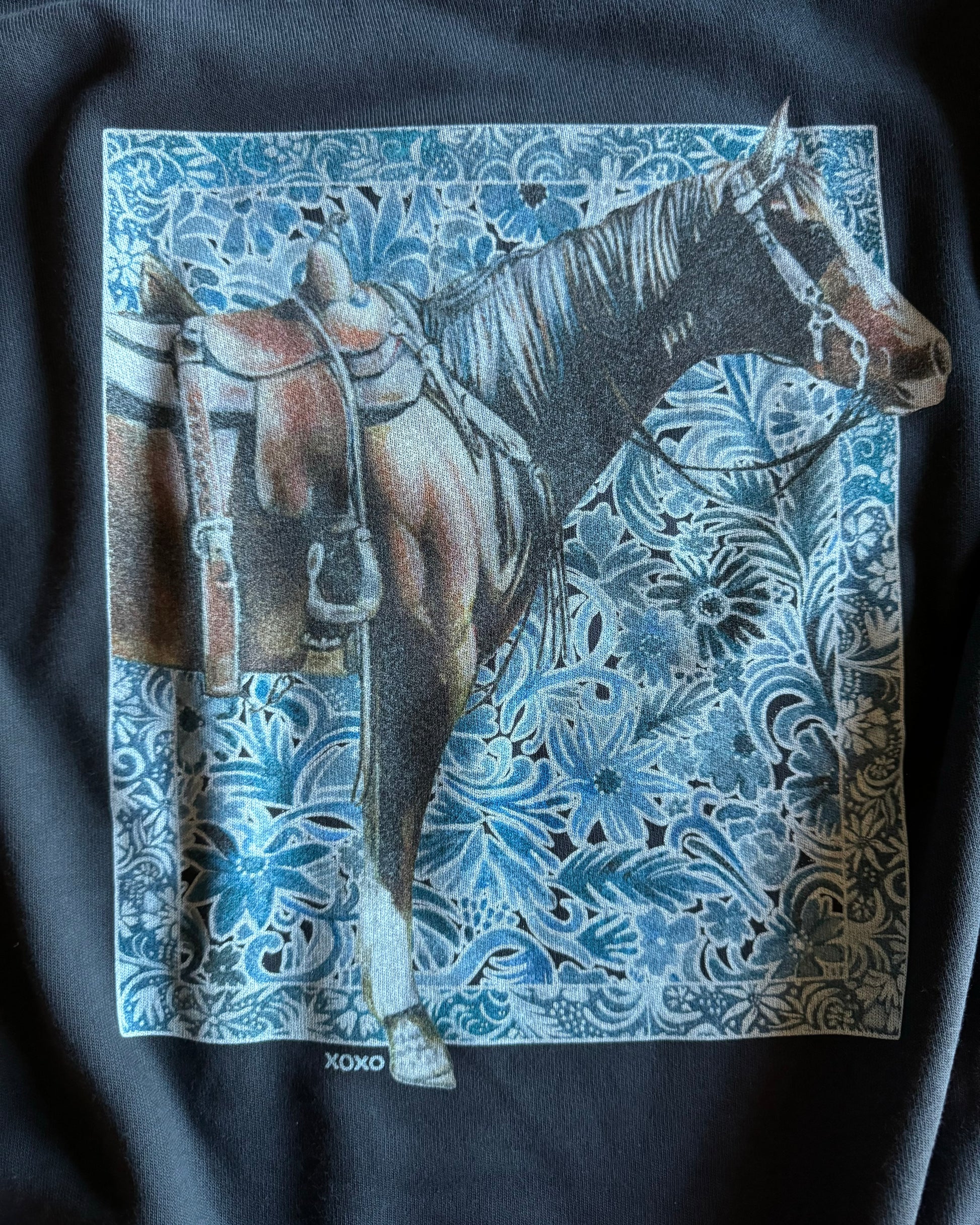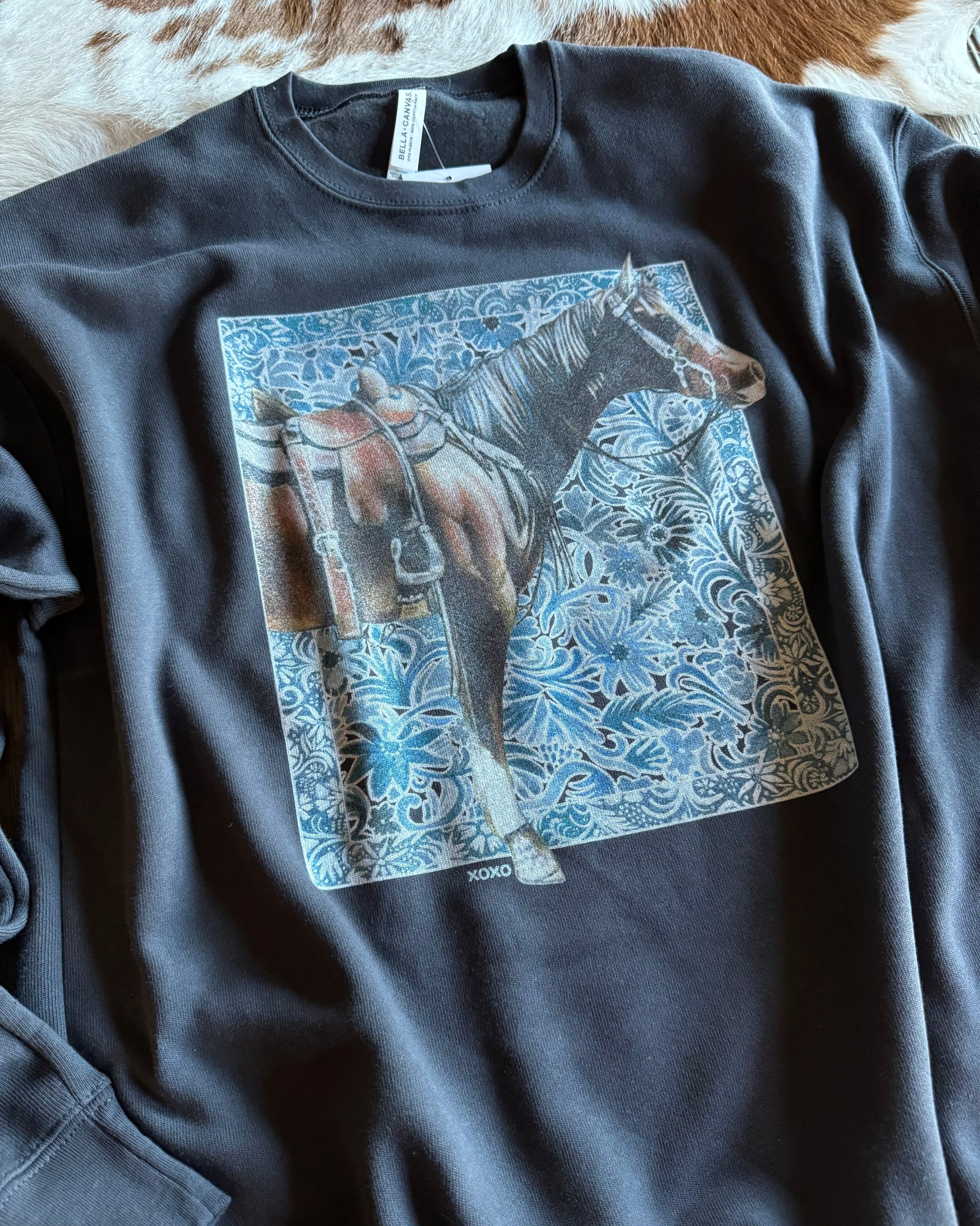 Get ready to ride into style with the Denim Horse Sweatshirt! This dark grey Bella Canvas sweatshirt features an original western horse design on a denim floral background, created by XOXOart. Stay warm and stand out with this unique and eye-catching piece.
