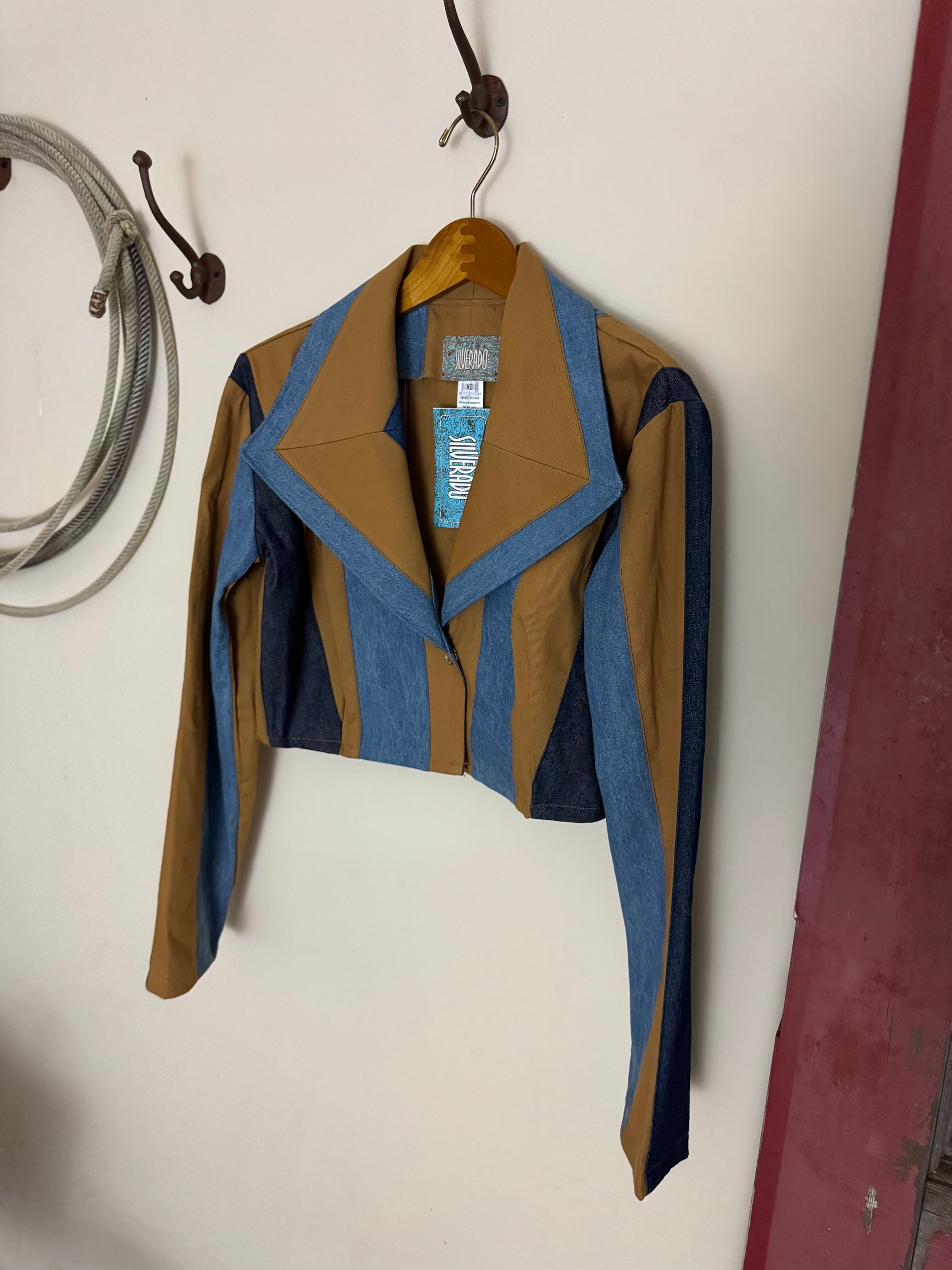 A striking blend of retro Western flare and modern edge, the Iris Jacket from Silverado is made for the cowgirl who loves a statement moment. Crafted in the signature Laramie fabric, this cropped jacket features bold paneling in denim and rich camel tones that instantly elevate any outfit—from arena days to night-out plans.