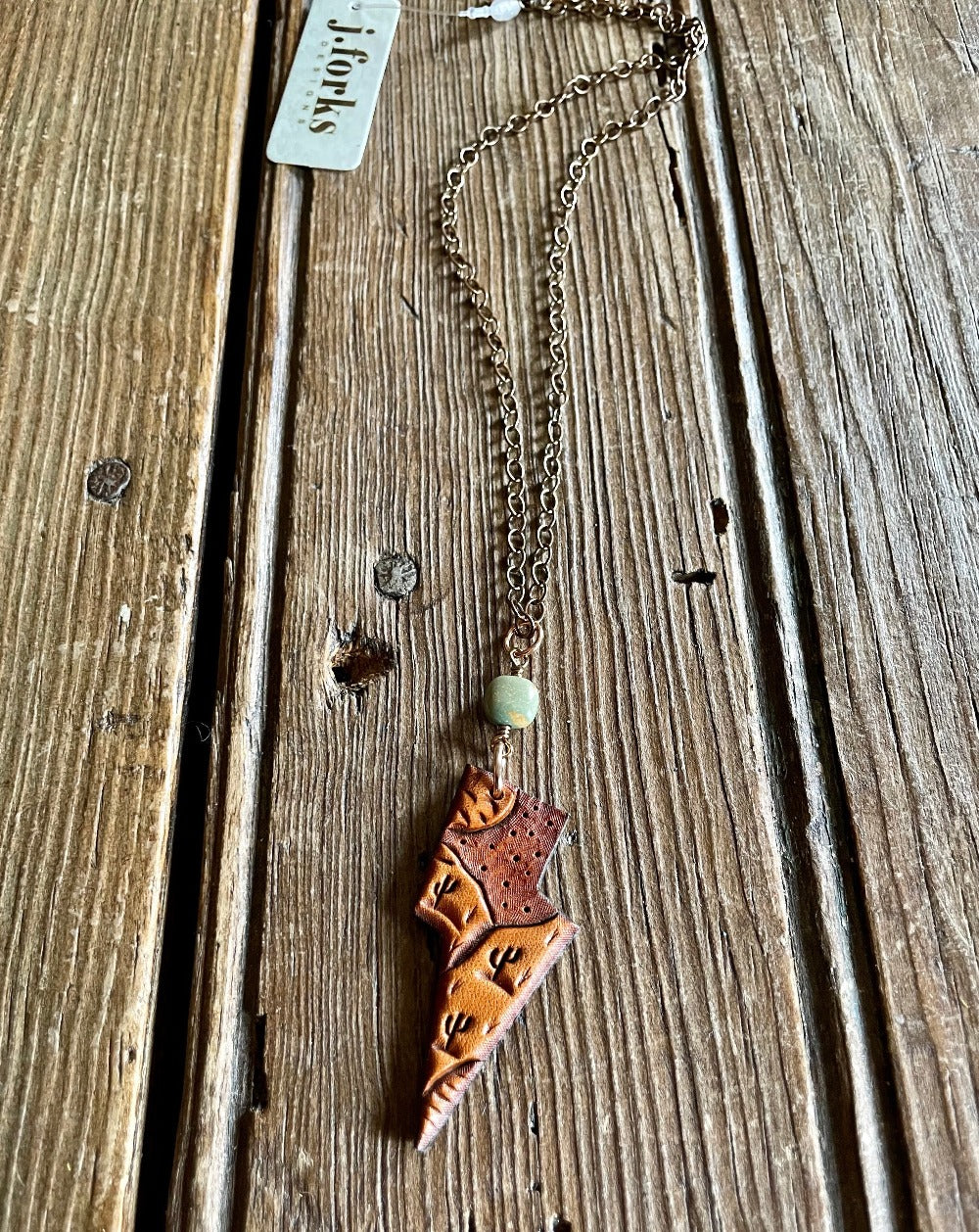 17" Dark Bronze Chain with Kingman Turquoise and Hand Tooled Leather Lightning Bolt Pendant with Bronze Lobster Claw Clasp.