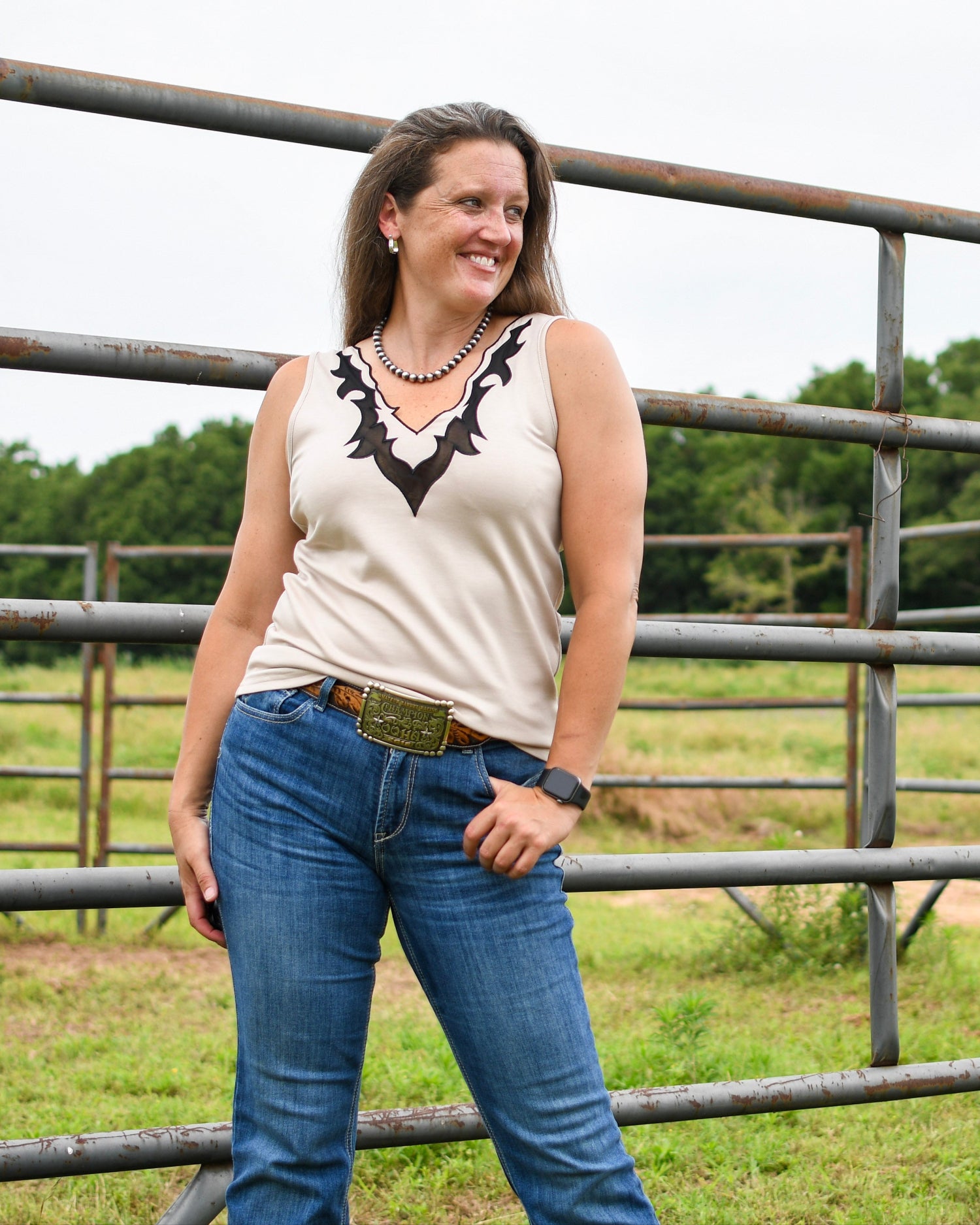 Experience effortless style and comfort with the Llano Tank in Dust. Crafted from soft, stretchy fabric, this tank hugs your body while allowing easy movement. Its dusty nude shade offers a subtle, versatile look, complemented by a flattering V neckline at both front and back. The unique cutout boot stitch design along the front neckline, filled with delicate black sheer fabric, adds an eye-catching detail that elevates your everyday wardrobe. Perfect for layering or wearing solo, the Llano Tank blends comfort and chic sophistication seamlessly.