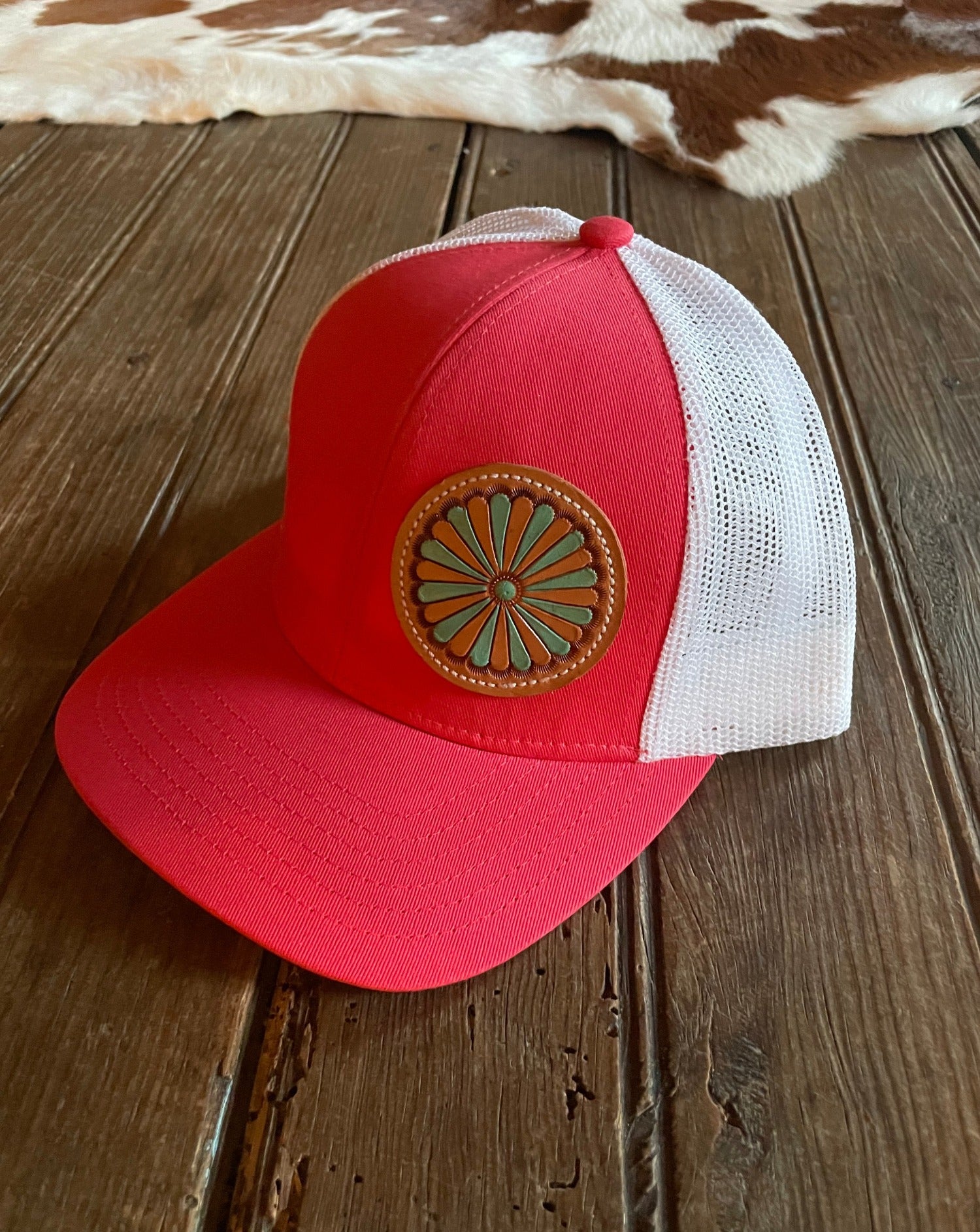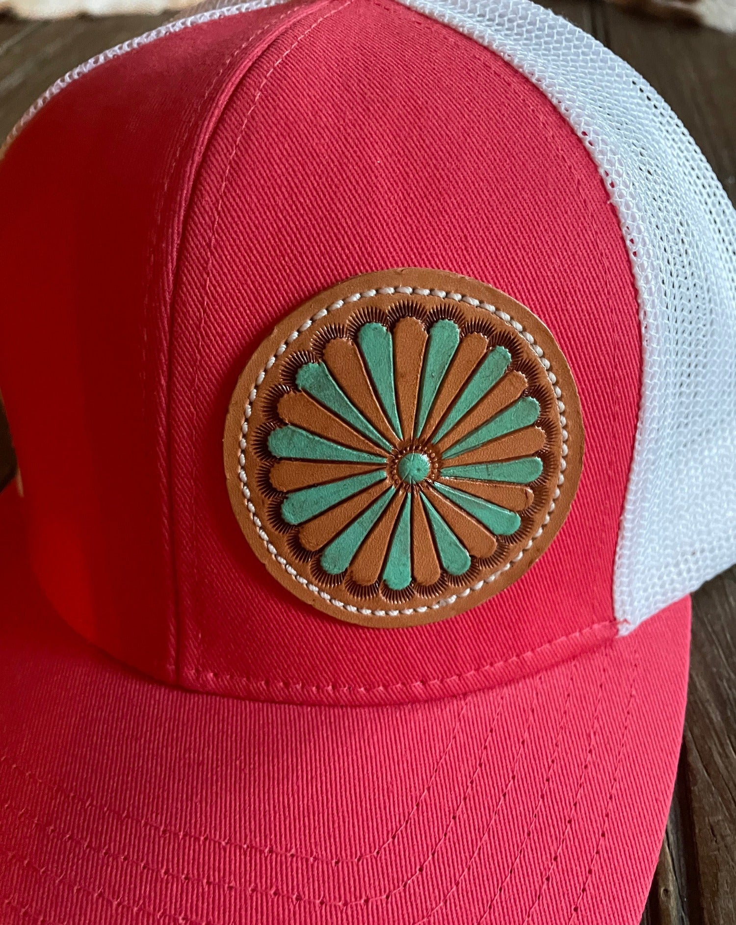 Our Rosita Cap is a true work of art! Crafted from hand-tooled leather with a needlepoint concho and hand-painted leather design, it is the ultimate combination of style and quality. The mesh back and snap back make for a perfect fit, just like Richardson 112. This coral and white cap is your ticket to stand out in the crowd!
