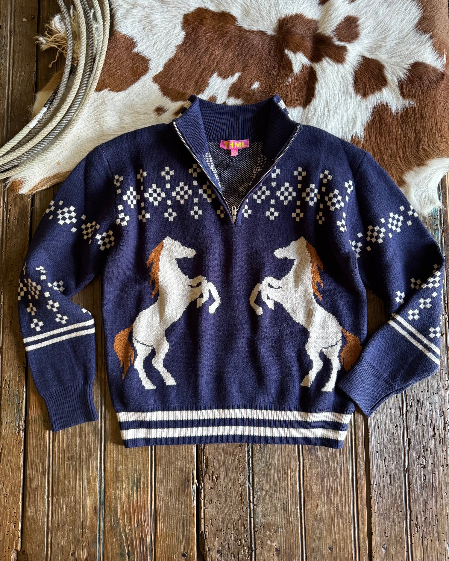 Bring the untamed spirit of the West into your wardrobe with the Cimarron Sweater. Featuring bold rearing horse graphics and classic southwestern motifs, this quarter-zip knit blends rugged cowboy heritage with modern western style. Designed for comfort and versatility, it’s the perfect layer for rodeo nights, ranch days, or casual outings that call for a touch of western flair.