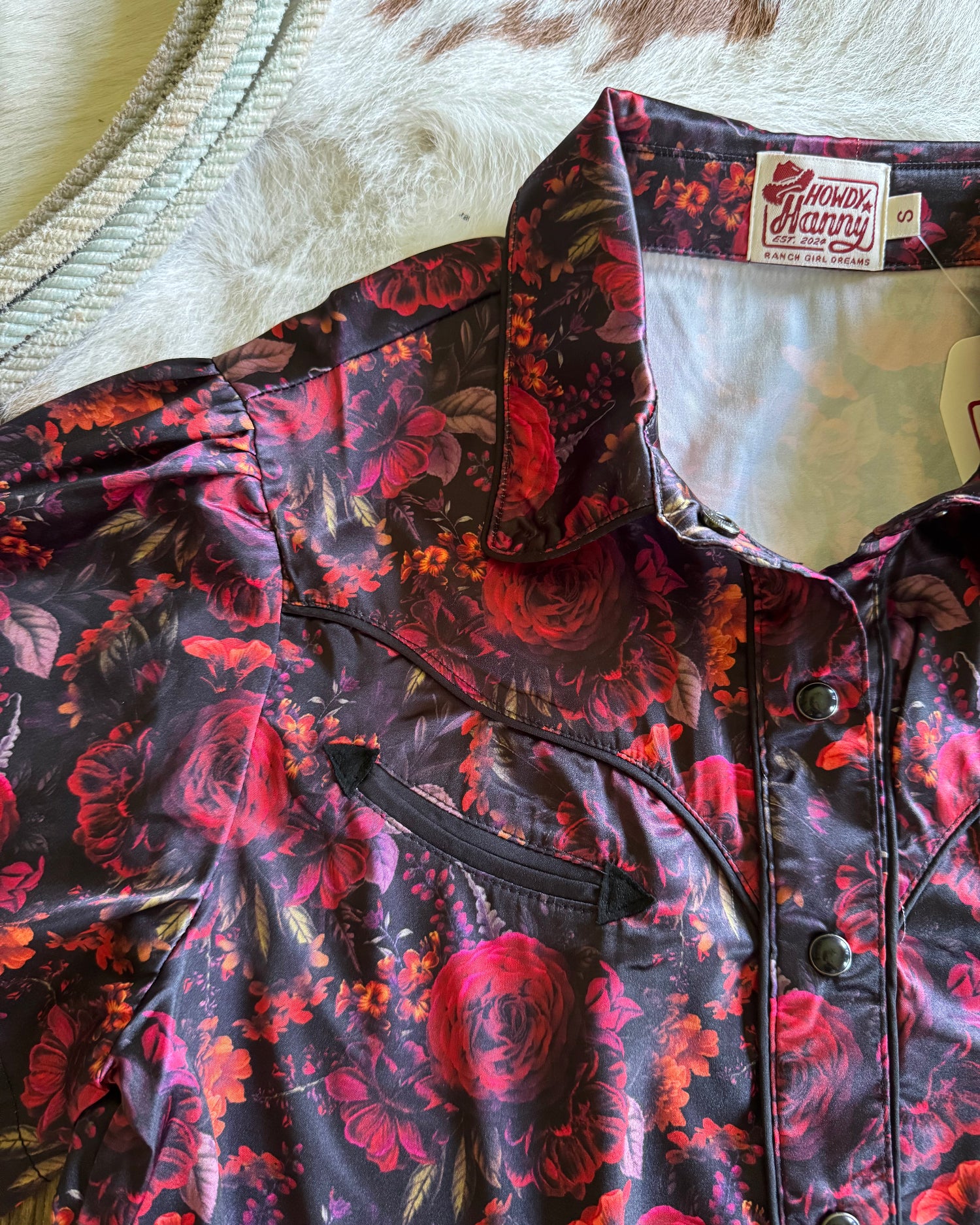 Bold, romantic, and unapologetically western—the Midnight Rose Blouse is a true showstopper. This women’s short sleeve western shirt features an all-over deep rose floral print on a dark background, perfect for making a statement in or out of the arena. Designed with classic western yokes, pearl snaps, and a flattering feminine cut, it’s equal parts edgy and elegant.