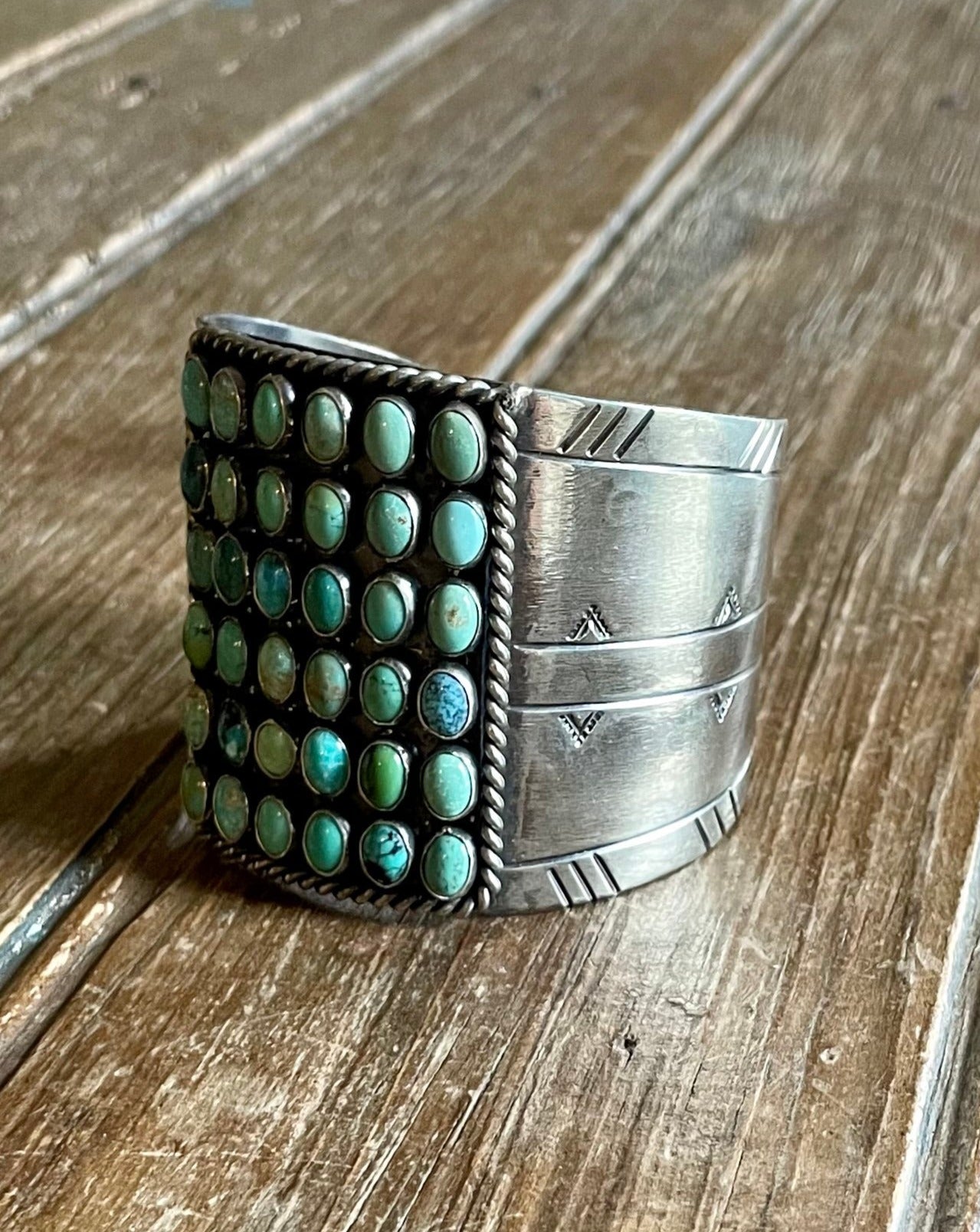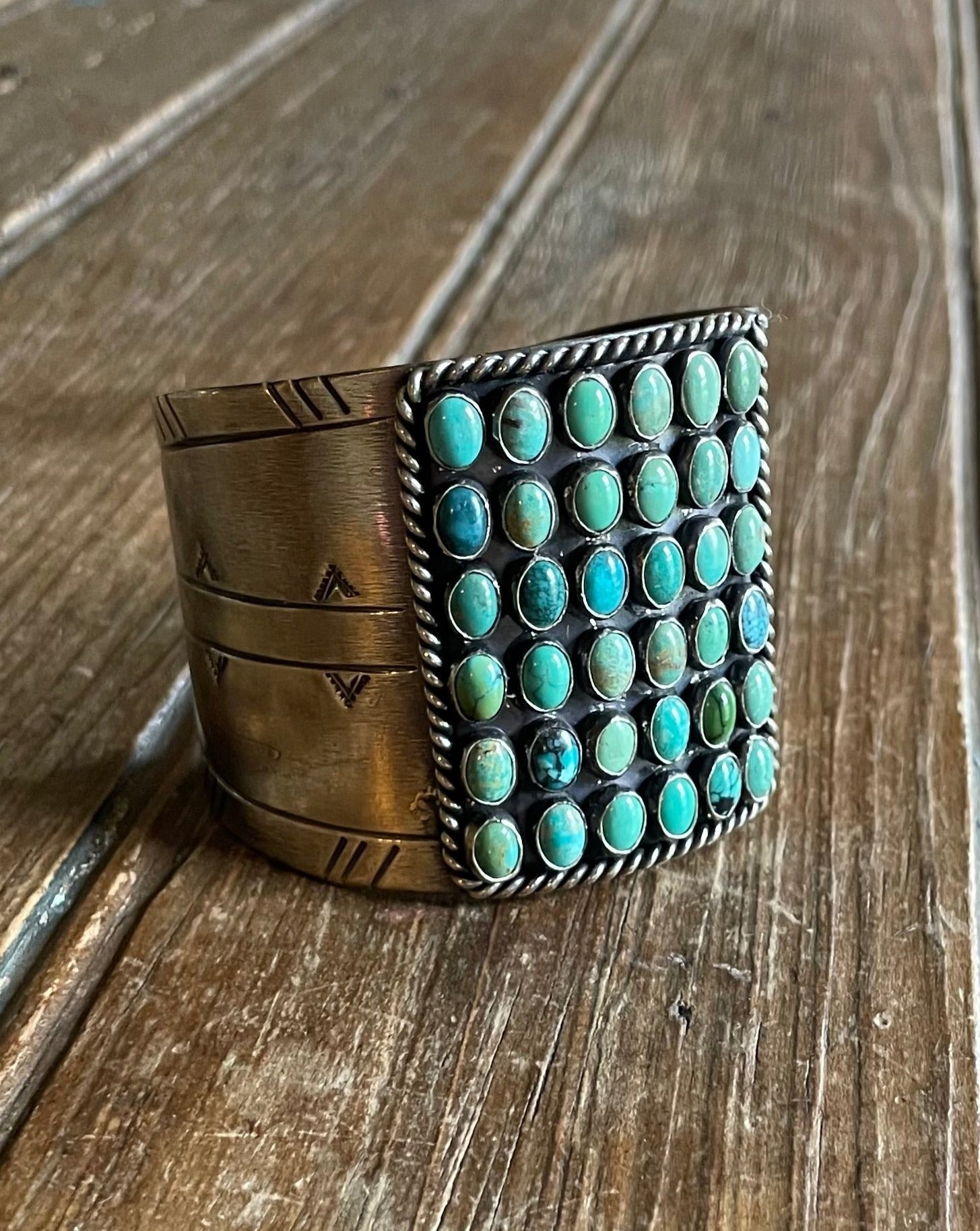 This unique bracelet from Paige Wallace is the perfect accessory for any look. Crafted from German silver, it features beautiful turquoise stones set in a wide cuff. Expertly carved and finished, it will add an eye-catching touch to any outfit.